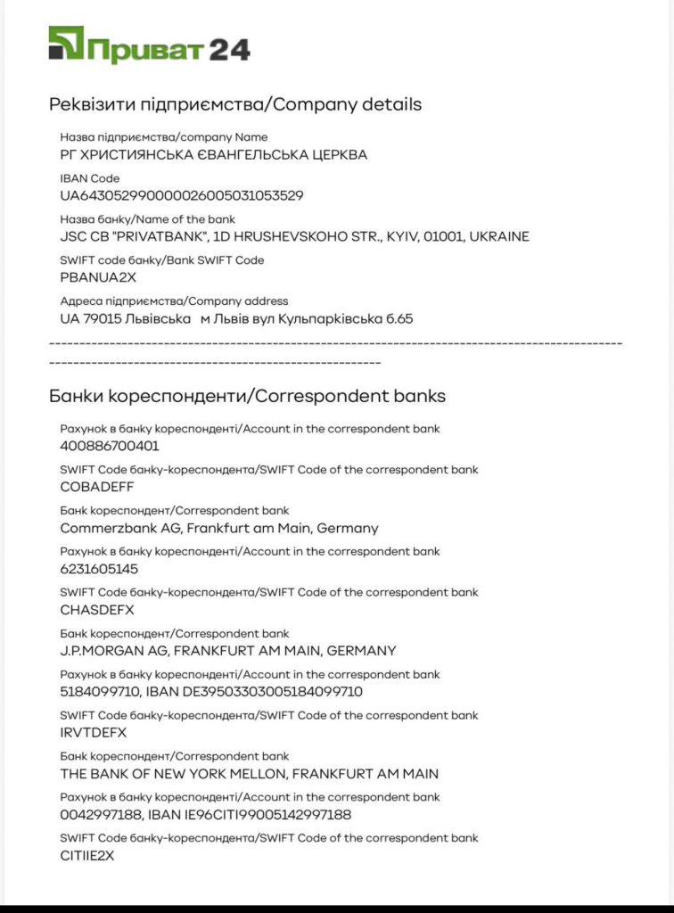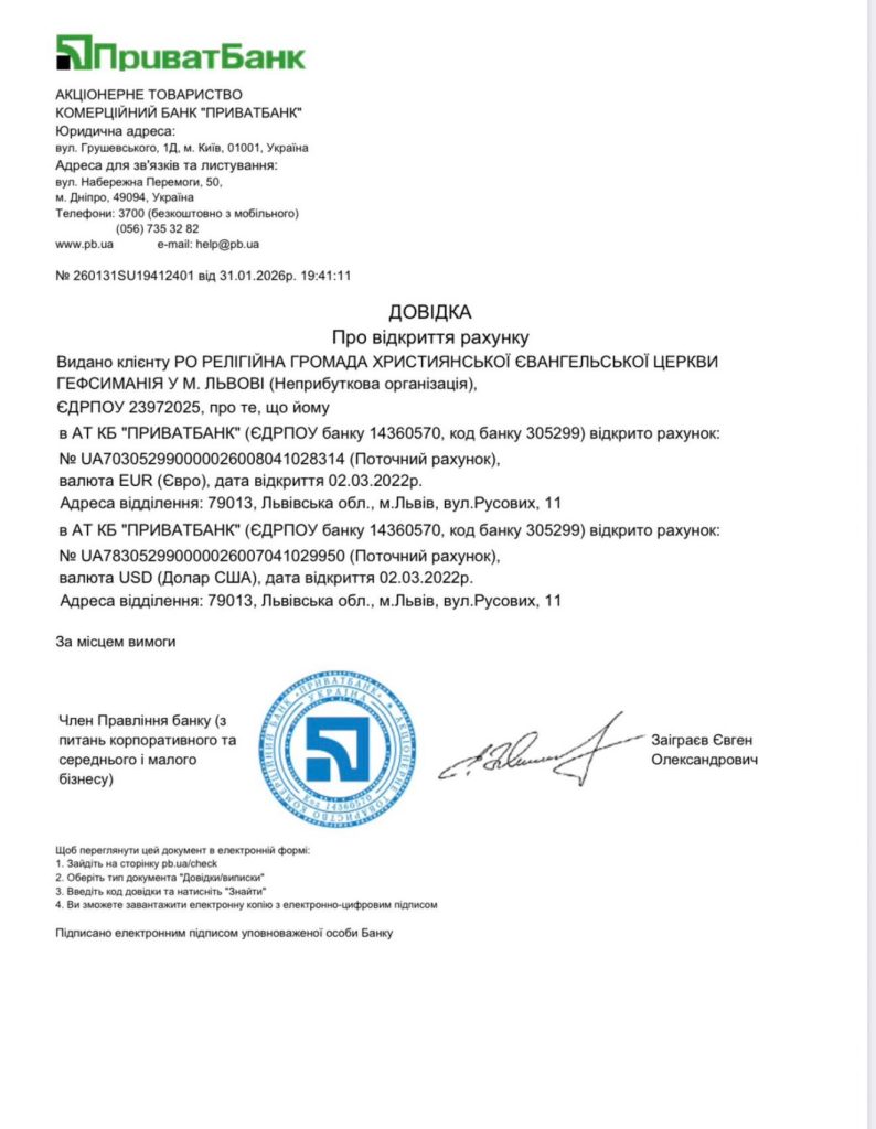 Одержувач: Християнська Євангельська Церква “Гефсиманія”