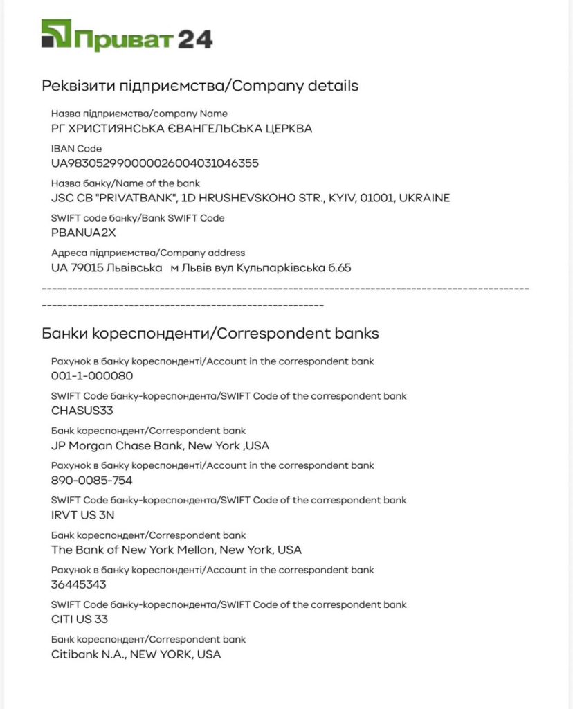 1. Реквізити для пожертв у церкву У ГРИВНЯХ